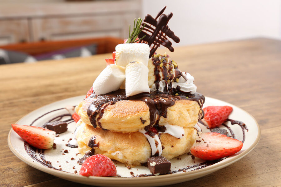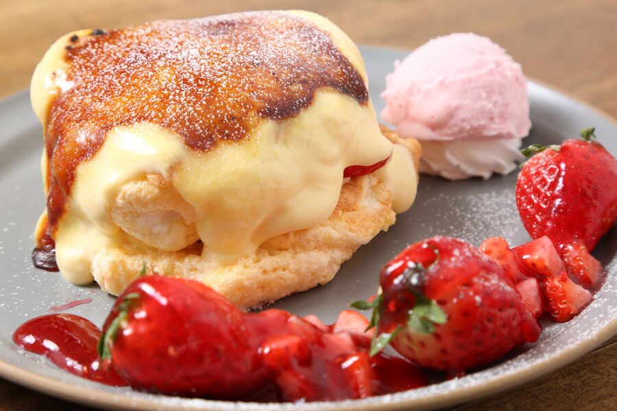 中でも人気なのが、旬の“いちご”をたっぷり使ったパンケーキ。ふわふわのパンケーキ生地に、甘さ控えめのクリームとたっぷりのいちご、さらにキャラメリゼやアイスなどを添えた豪華な一皿は、見た目も華やかで、まさに“贅沢スイーツ”。