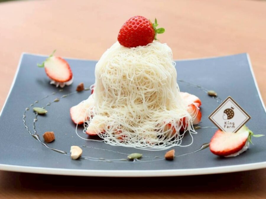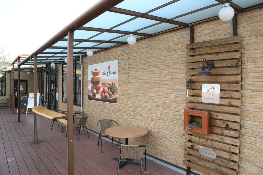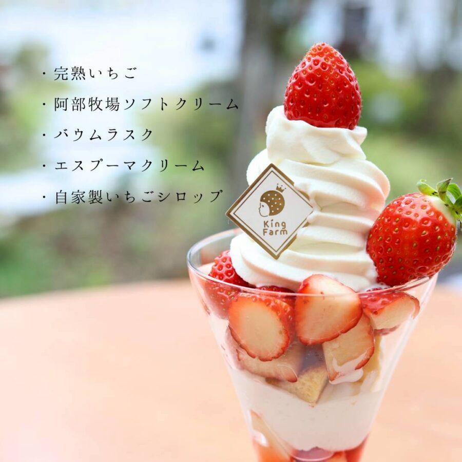 King Farm Cafe は、愛知県西尾市にある、農園直営ならではのフレッシュないちごとスイーツが楽しめるカフェ。園内で育てた完熟いちごをふんだんに使ったパフェやケーキ、自家製バウムクーヘンなど、旬の素材を生かしたメニューが揃っているよ。