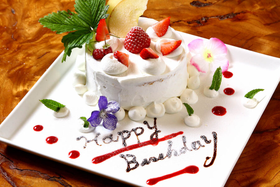 人数に合わせたアニヴァーサリーケーキ付き。前日までの予約制です。