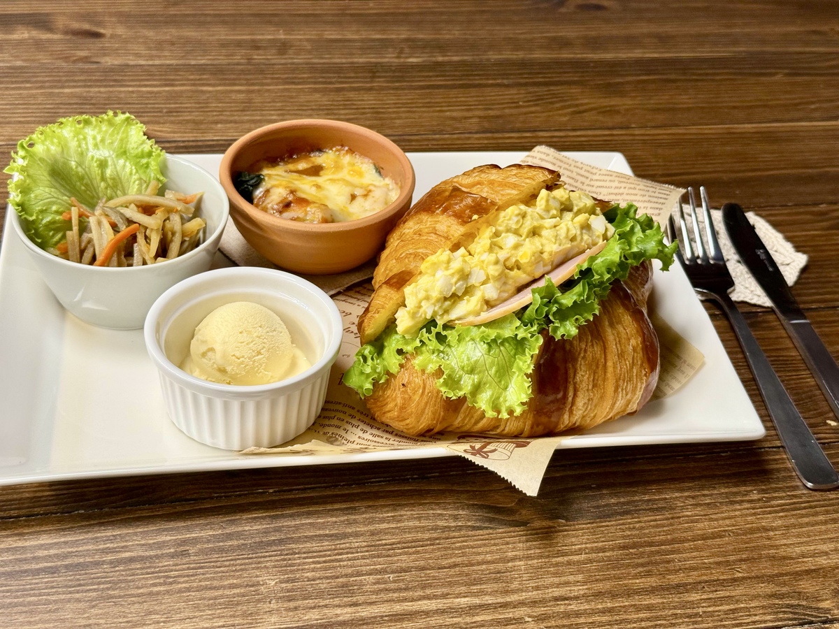 おすすめメニューOSUSUME MENU カフェ 【数量限定】大きなクロワッサンサンド(プレート/単品) ¥1,300(税込) カフェ ホットサンド ¥750(税込) カフェ シフォンケーキ(単品) ¥700(税込) カフェ 抹茶シフォンケーキ(単品) ¥800(税込) もっとみる