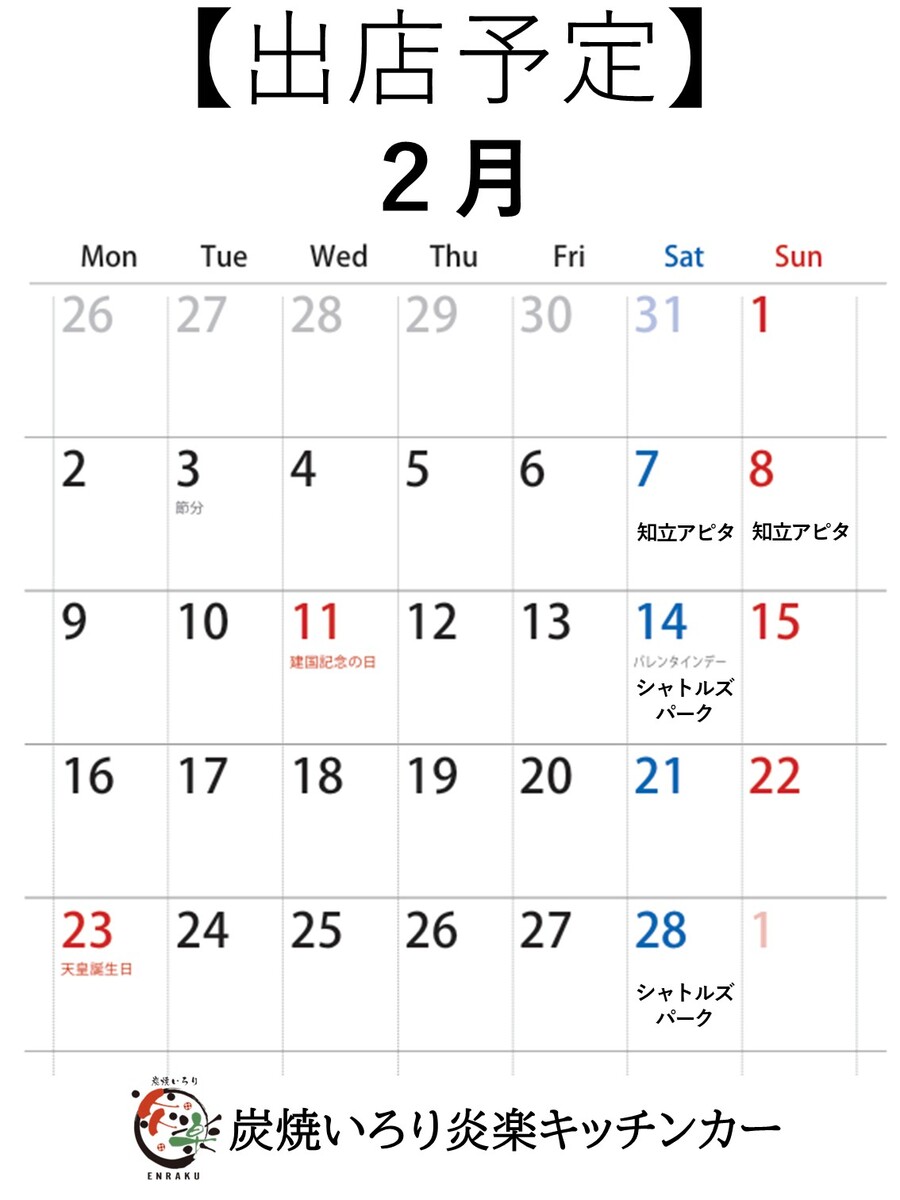 【キッチンカー炎楽】の2月の出店カレンダーです♪