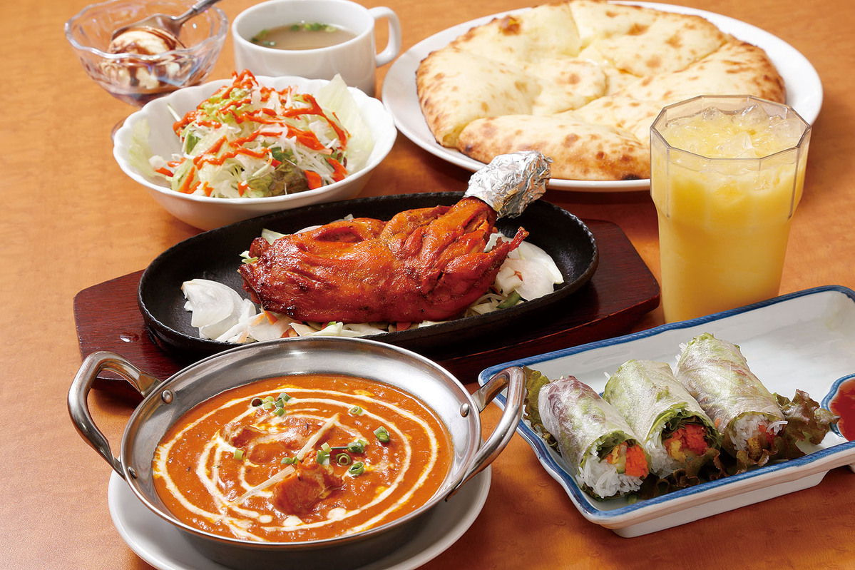 お好きなナンとカレー+生春巻き+タンドリー料理+サラダ+スープ+ソフトドリンク+アイスが付いたお得なセット