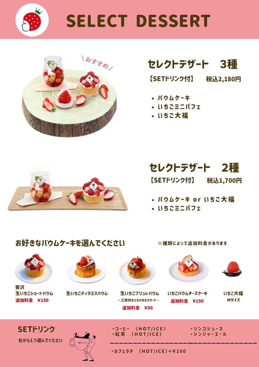 MENUメニュー おすすめメニューOSUSUME MENU カフェ 4/10~抹茶モンブランいちごパフェ ¥1,750~(税込) スイーツ 【生いちごブリュレ】 ー工房炊きとろけるカスタードー ¥730~(税込) カフェ ベリーちゃんのいちごパフェ 12/12〜 ¥1,600~(税込) スイーツ いちごパフェ ¥1,300(税込) メニューMENU 季節限定スイーツ 旬のフルーツを使用した贅沢なスイーツ♪ 抹茶モンブランいちごパフェ(4/10~販売) 単品 1,750円/いちごプレート付き 2,300円 2026年4月10日(金)より新登場! 西尾抹茶を使用した“極細0.7mm”の抹茶モンブランと、完熟いちごを贅沢に楽しめる春限定パフェです。 抹茶アイスやソフトクリーム、ムースなどが重なり、最後まで飽きずに味わえる一品。写真映えも抜群で、カフェ巡りにもおすすめ◎ ベリーちゃんのタワーいちごパフェ 単品 1,950円/プレート付き 2,480円 2個盛り合わせ/プレート付き 4,960円 ※写真は2個盛りです。 最大6個まで盛り合わせできます! ベリーちゃんのいちごパフェ(12/12~販売) 単品 1,600円/プレート付き 2,150円 毎年人気の季節限定スイーツ「ベリーちゃんのいちごパフェ」が、今年もパワーアップして登場。 1個から最大6個盛り合わせ?! いちごを贅沢に使用し、見た目も味わいもさらに華やかになりました。 King Farmならではの“農園直送いちご”をたっぷり使用。 完熟いちごならではの濃い甘みと爽やかな香りが、グラスの中いっぱいに広がります。 シェアして楽しめば、まるでいちご狩り気分。 写真映えするかわいらしいビジュアルで、記念日やお出かけにもぴったりです。 最新情報はInstagramにてご紹介しています。 ご来店の際はお席のご予約も可能です。 セレクトデザート(セットドリンク付き) 2種 1,700円 3種 2,180円 ランチメニュー 11:00~14:00 中学生以上のお客様はお一人様1オーダーお願いします 〇バウムキッシュプレート (本日のバウムクーヘンキッシュ・季節のスープ・フルーツ入りサラダ・デリ3種) 〇選べるミニランチ (クリームオムライス・桜えびと春野菜のパスタ・牛バラの赤ワイン煮+400円) 〇ランチデザート バウムクーヘントライフル ミニいちごパフェ +700円 いちごバウムチーズケーキ +730円 ベリーちゃんのいちごパフェ +1,500円 〇セットドリンク (コーヒーHOT/ICE・紅茶HOT/ICE・りんごジュース・ジンジャーエール カフェラテHOT/ICE +100円) ※ドリンクなしの場合は100円引きです ●スペシャルランチセット 2,200円 バウムキッシュプレート+選べるミニランチ⁺ランチデザート+セットドリンク ※選べるミニランチ 上記より1品お選びください ※ランチデザート 上記より1品お選びください ※セットドリンク 上記より1つお選びください ●ランチとスイーツのセット お好きなスイーツの単品価格+1,100円 選べるミニランチorバウムキッシュプレート+お好きなスイーツ+セットドリンク ※選べるミニランチ 上記より1品お選びください ※お好きなスイーツ グランドメニュー表より1品お選びください ※セットドリンク 上記より1つお選びください ●レギュラーランチセット 1,680円~ 選べるレギュラーランチ+サラダ+セットドリンク ※選べるレギュラーランチ 下記よりお選びください (クリームオムライス・桜えびと春野菜のパスタ・牛バラの赤ワイン煮+400円) オムライス・パスタ大盛り+400円 煮込み大盛り+500円 ※セットドリンク 上記よりお選びください ●バウムキッシュプレートセット 1,200円 本日のバウムクーヘンキッシュ 季節のスープ フルーツ入りサラダ デリ3種 セットドリンク ※本日のプレート内容はスタッフにお尋ねください。 定番スイーツメニュー ドリンクセットの場合ドリンク代100円引き ●生いちごブリュレ ー工房炊きとろけるカスタードー イートイン730円 / テイクアウト780円 ブリュレバウムケーキがさらに美味しくリニューアル! 工房で丁寧に炊き上げた、とろけるカスタードをたっぷり詰め込んだブリュレバウム。 香ばしいキャラメリゼと今だけの生いちごの甘酸っぱさが重なる、贅沢な一皿です。 ●バウムフレンチ 990円 新感覚の贅沢な バウムクーヘンのフレンチトーストです ●バウムクーヘンの盛り合わせ 680円 ソフトバウム3種とハードバウムの盛り合わせ ●濃厚ソフトクリーム ・プレーンソフト 550円 ・いちごソフト 640円 ・抹茶ソフト 640円 季節限定のバウムケーキ 季節限定 ドリンクとセットの場合はドリンク代100円引き 【NEW】数量限定!もちもち生いちご大福バウム 830円 【NEW】贅沢生いちごショートバウム 830円 パリパリチョコティラミス イートイン680円 / テイクアウト730円 いちごバウムチーズケーキ イートイン830円/テイクアウト880円 ドリンクメニュー 単品ドリンクはミニバウムクーヘン付 ●プレミアムドリンク ※数量限定 生いちごジュース 980円 生いちごミルク 950円 ※その日のいちごにより、色味に個体差がありますが、品質に問題はございません。 ●オリジナルドリンク いちごスムージー 600円 いちごスムージーソフト 880円 自家製いちごジャム紅茶(HOT) 550円 ●コーヒー・紅茶 