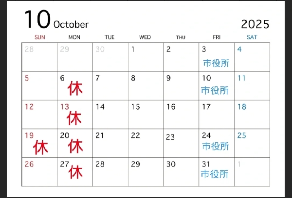 10月のお休みのお知らせです☆ よろしくお願い致します