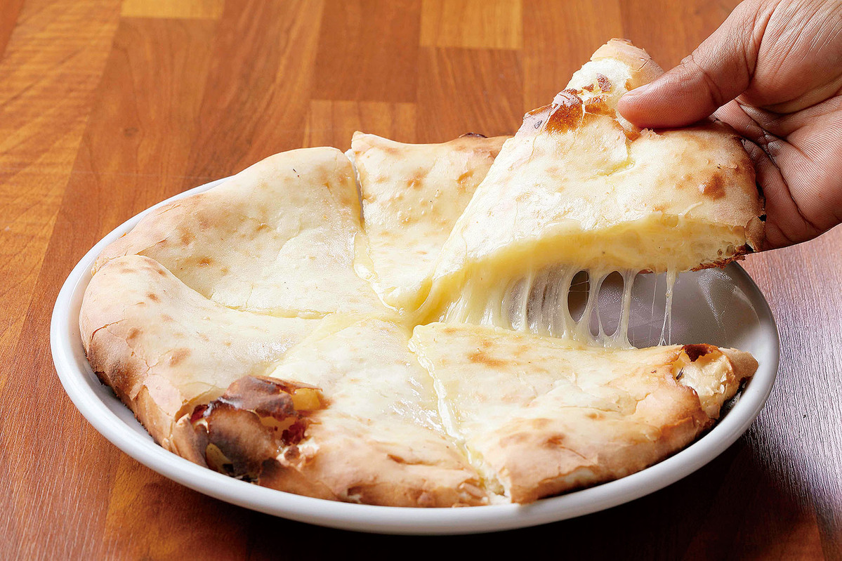 写真のオリジナルミックスチーズを使用した「チーズナン」は、試作を何度も重ねてできたこだわりの逸品。ナンは10種類以上と種類豊富!