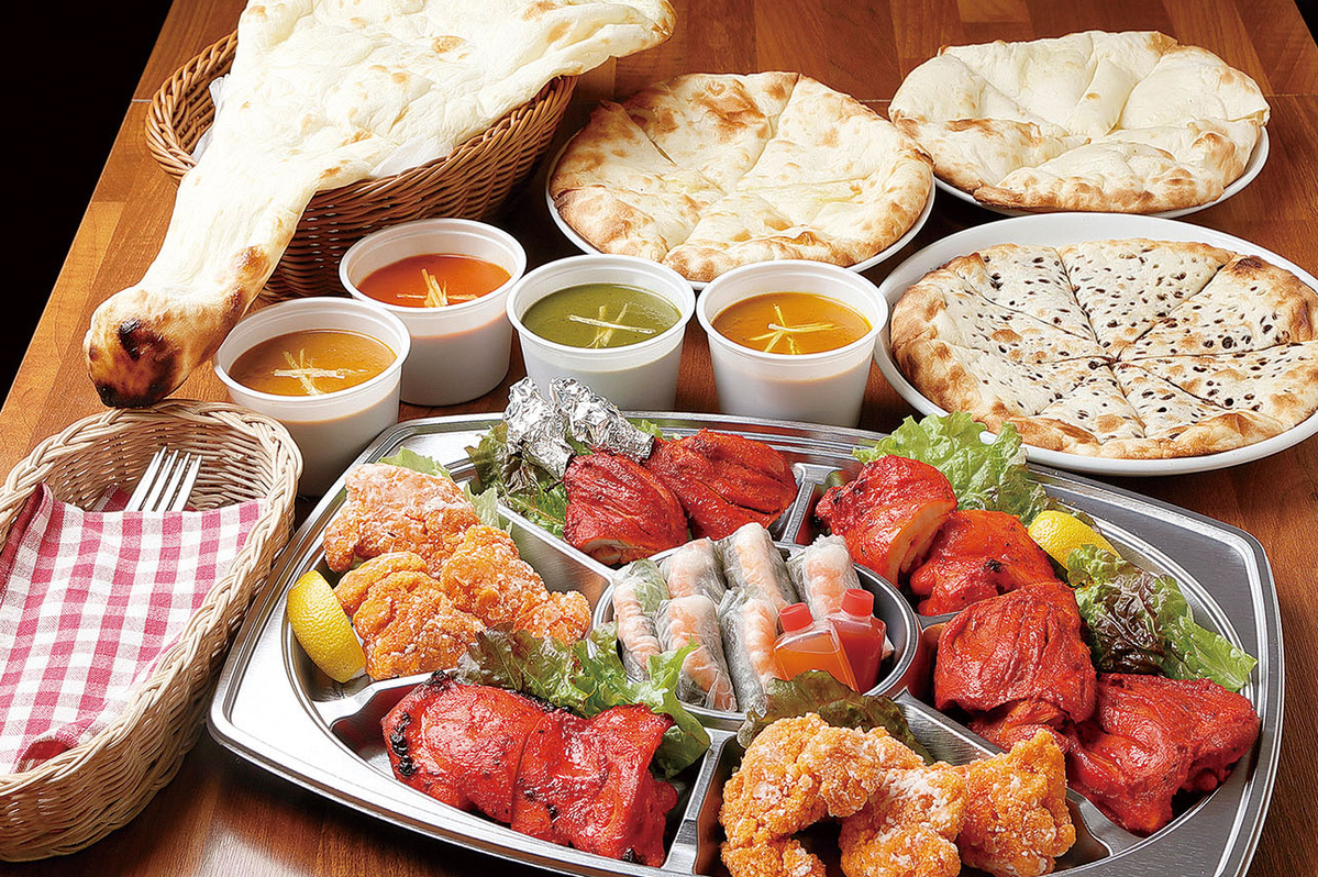 人気のカレー4品、ナン4品の他、タンドリーチキンや生春巻きなど。今ならクーポン持参でお得に!!