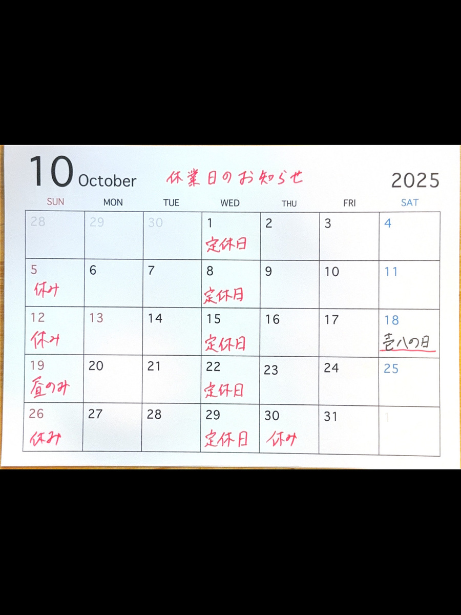 他の記事をみる 定休日&臨時休業 2024.11.01 11月のお休み情報 イベント情報 2023.12.17 お得なキャンペーン 定休日&臨時休業 2023.07.05 定休日変更のお知らせ スタッフのつぶやき 2023.05.15 ★情報誌chaooに載りました★