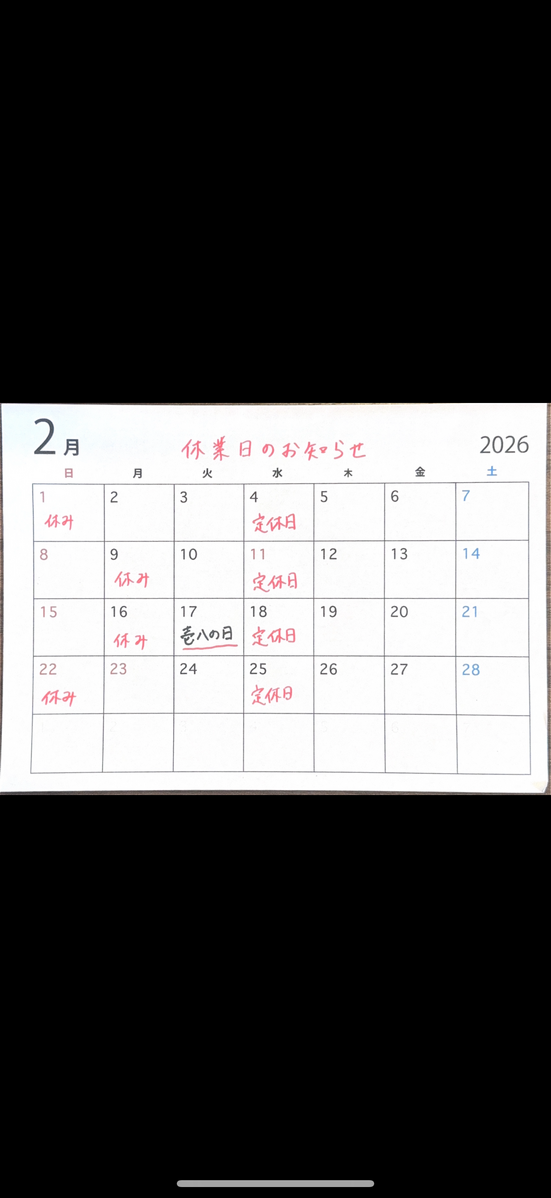 他の記事をみる 定休日&臨時休業 2026.01.12 1月のお休み情報 定休日&臨時休業 2024.11.01 11月のお休み情報 イベント情報 2023.12.17 お得なキャンペーン 定休日&臨時休業 2023.07.05 定休日変更のお知らせ