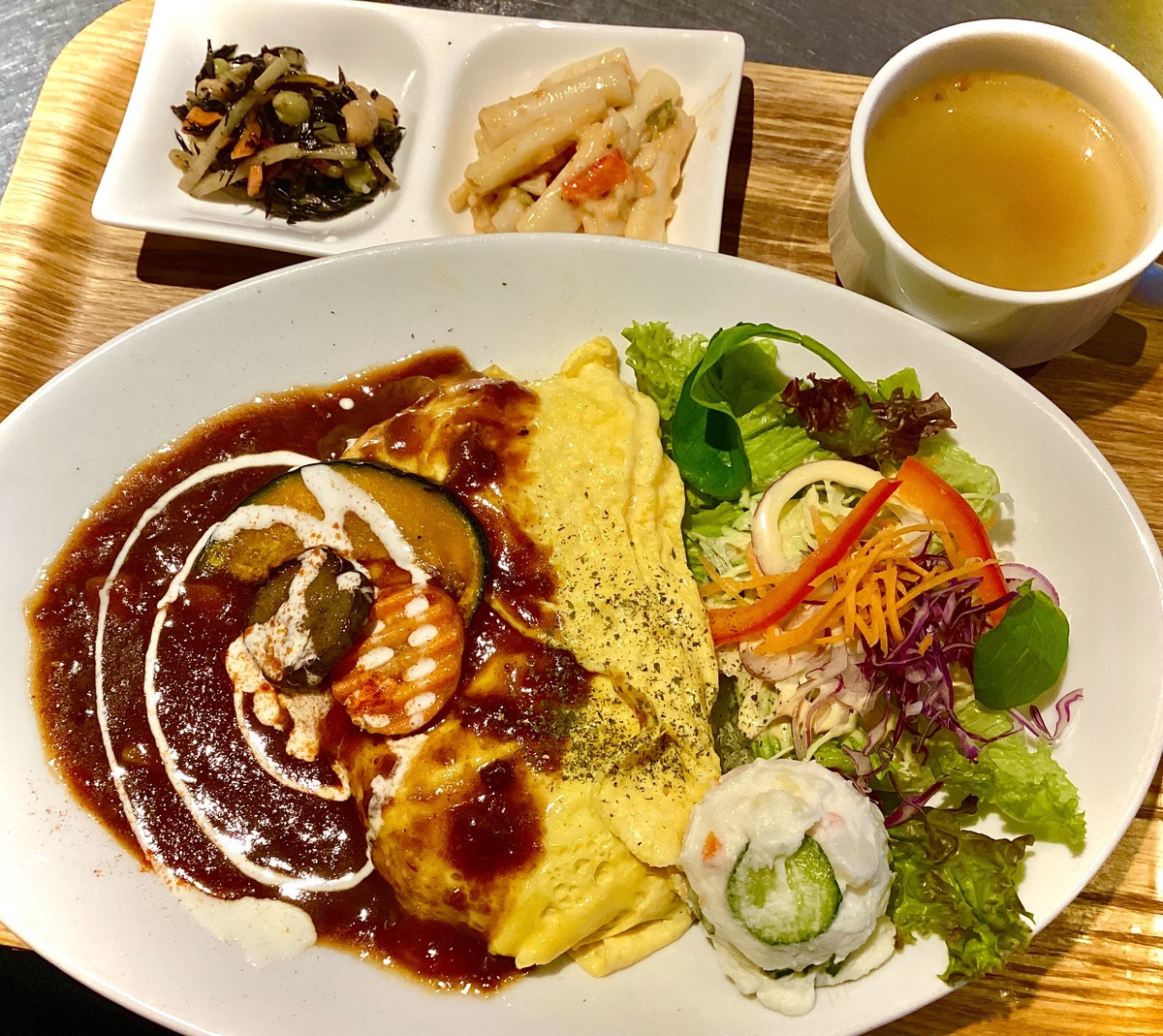 【営業中】写真『デミハヤシオムライス』季節デザート『大学芋&アイスクリーム』『ティラミス・パフェ』200円~