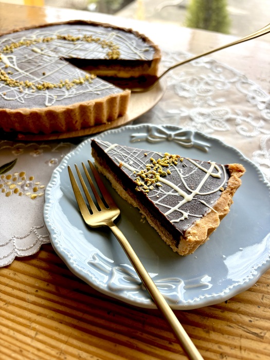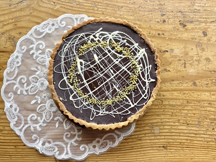 話題のドバイチョコをタルト生地に流し込みました。