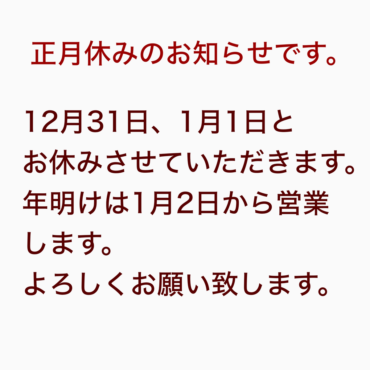 定休日&臨時休業2025.12.31 正月休みのお知らせです。 本年も格別のご愛顧を賜り、厚く御礼申し上げます。 来年も皆さまに喜んでいただけるお店作りに励んでまいります。 新しい年が皆さまにとって素晴らしいものとなりますように。