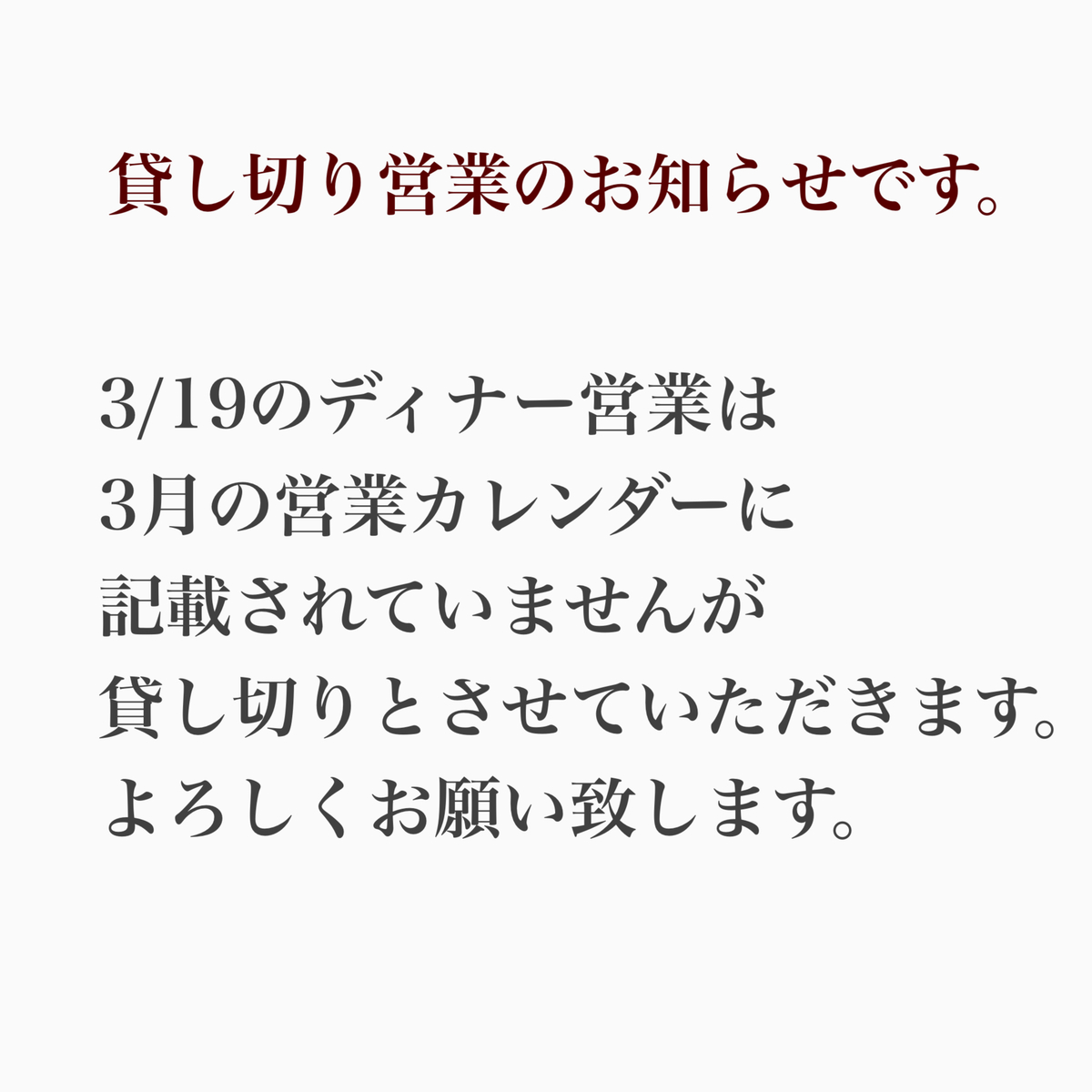 明日3/19のディナー営業は貸し切りとさせていただきます。